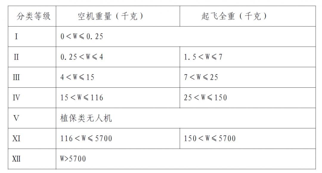 无人机根据空机重量和起飞全重可以被划分为7个等级。